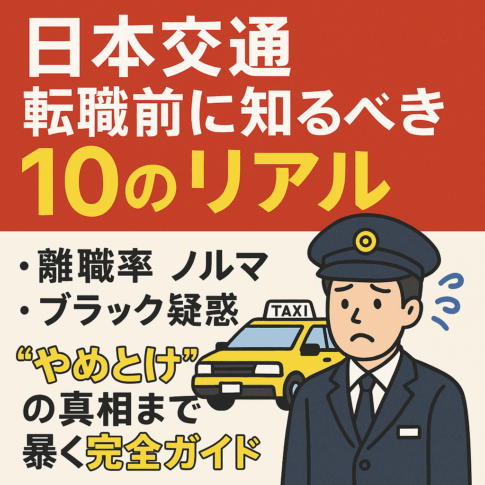 未分類「日本交通 やばい」という検索結果に不安を感じていませんか?本記事では、最大手ならではの強みと厳しさ、口コミの裏側の読み方、向いている人・向かない人の違いまでを中立に解説。入社前に知るべき10の論点と、後悔しない意思決定...